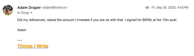 I said yes immediately. Doug is the type of founder that can take complex topics and communicate them in the simplest of terms. He was high energy and optimistic, it was one of the most no-brainer decisions I have made as an early stage investor.